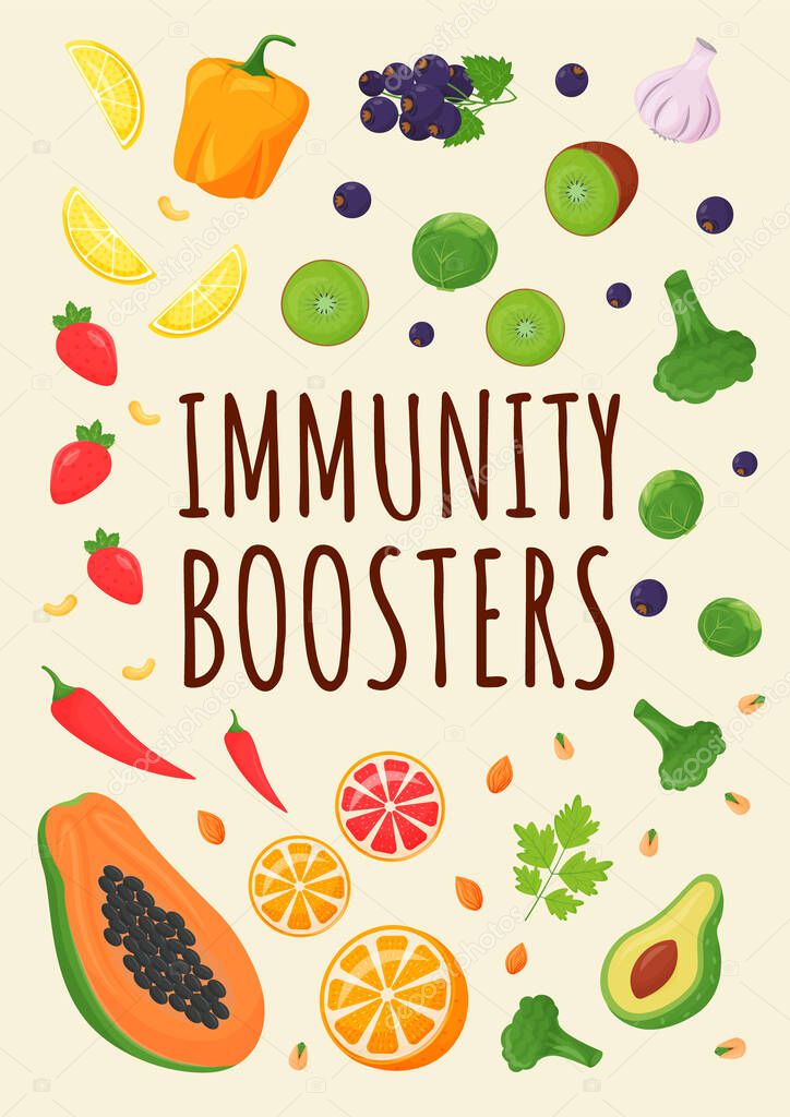Immunity Boosters Poster Flat Vector Template Fresh Fruits And Vegetables For Healthy Diet Products Rich Of Vitamins Brochure Booklet One Page Concept Design Balanced Nutrition Flyer Leaflet Premium Vector In Adobe