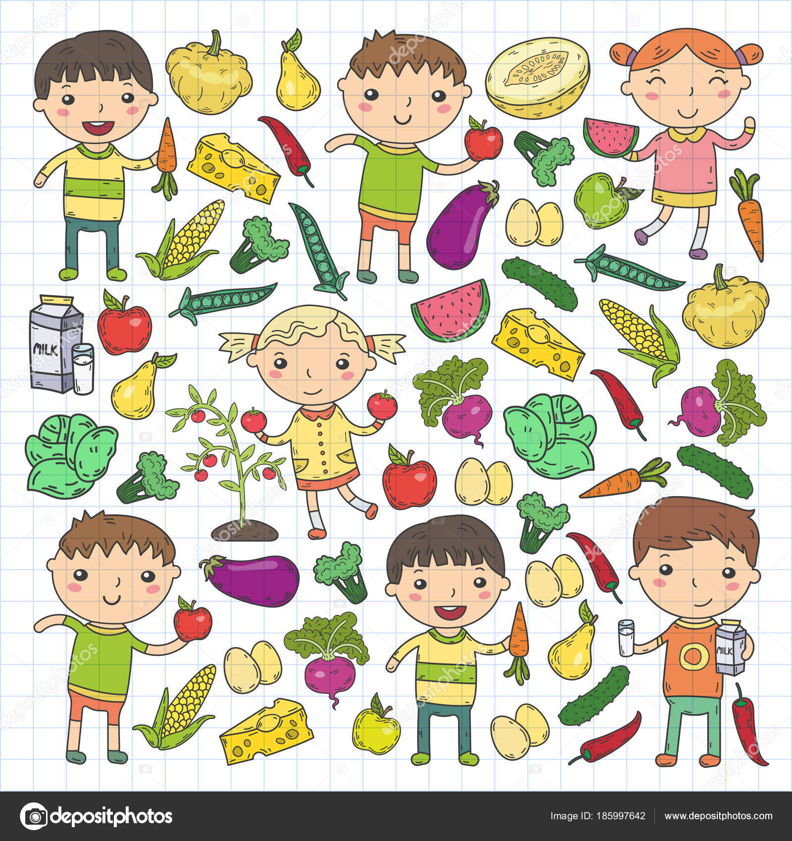 Kindergarten Nursery Preschool School Kids Eat Healthy Food Boys And Girls With Fruits And Vegetables Children Cafe Menu Restaurant Vitamins Stock Vector C Helen F 185997642