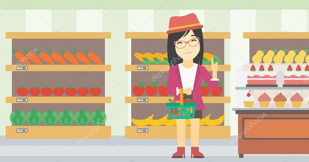 An Asian Young Woman Holding Basket With Healthy Food And Refusing Junk Food Woman Choosing Healthy Food And Rejecting Junk Food In Supermarket Vector Flat Design Illustration Horizontal Layout Premium Vector