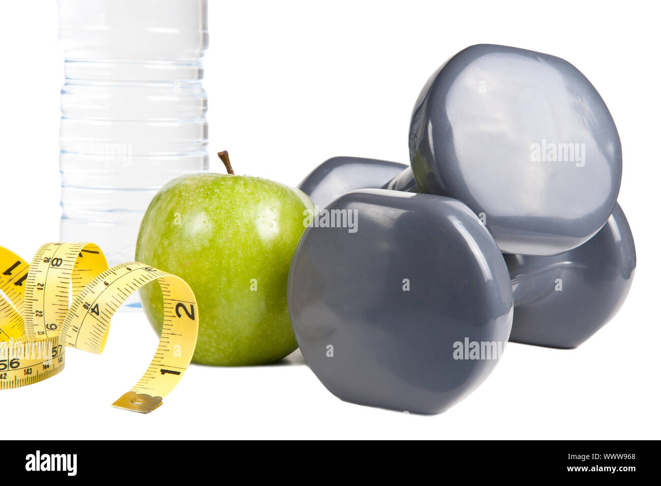 Pair Of Dumbbells Green Apple Measuring Tape And Bottle Of Water Exercise And Healthy Diet Concept Stock Photo Alamy