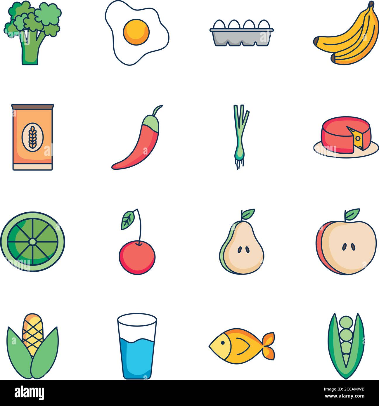 Icon Set Of Healthy Food And Water Glass Over White Background Line Fill Style Vector Illustration Stock Vector Image Art Alamy