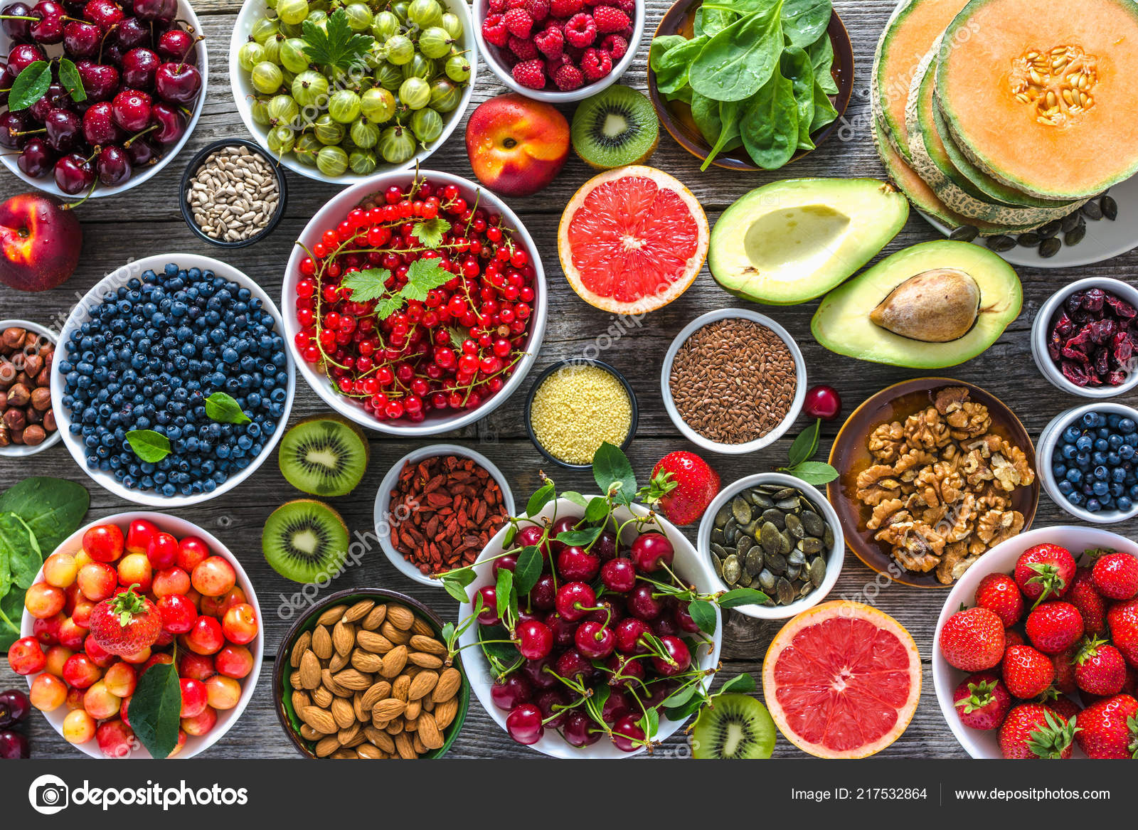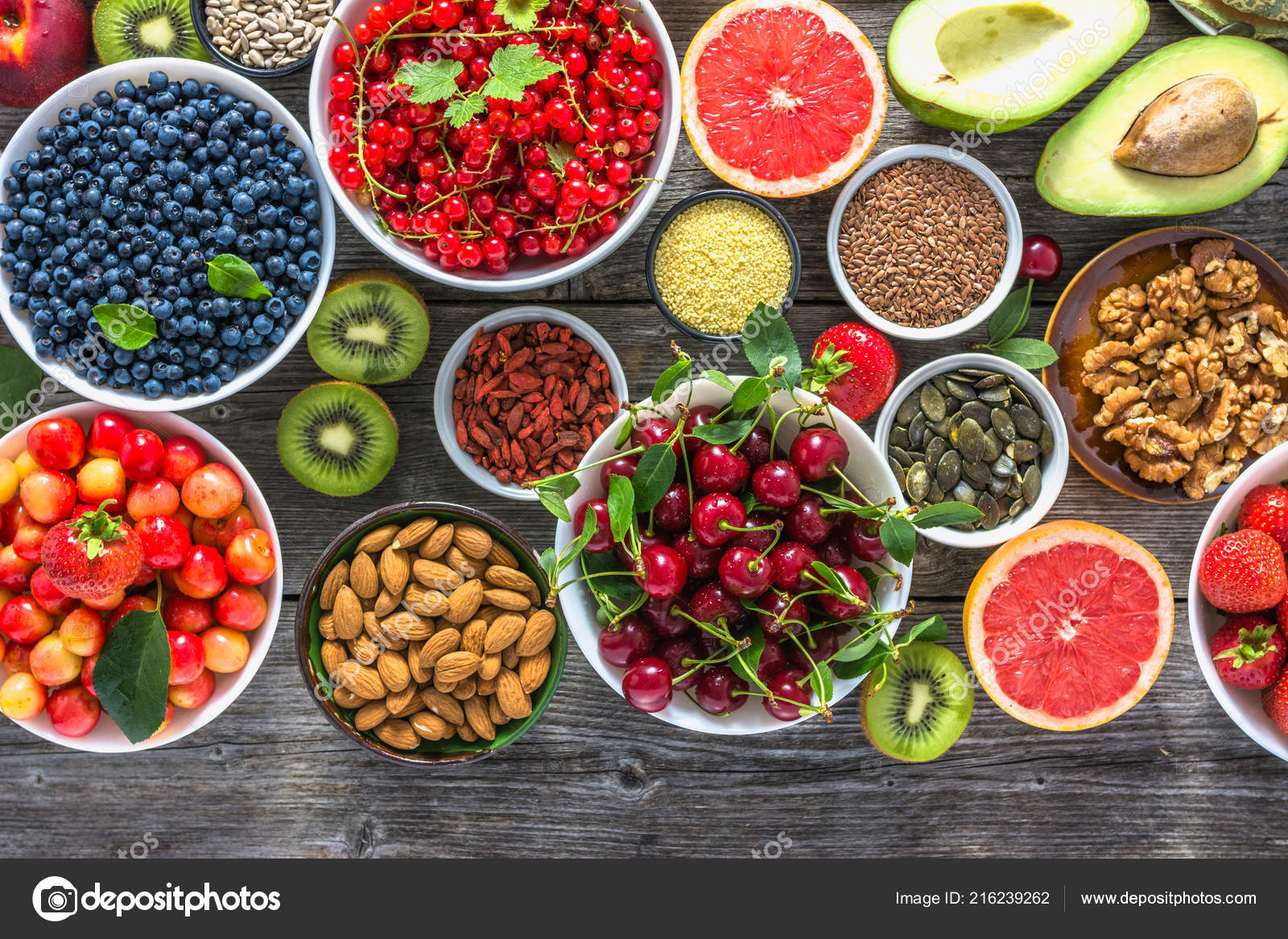 Healthy Food Selection Super Foods Table Breakfast Bowls Fruits Fresh Stock Photo C Alicjane 216239262